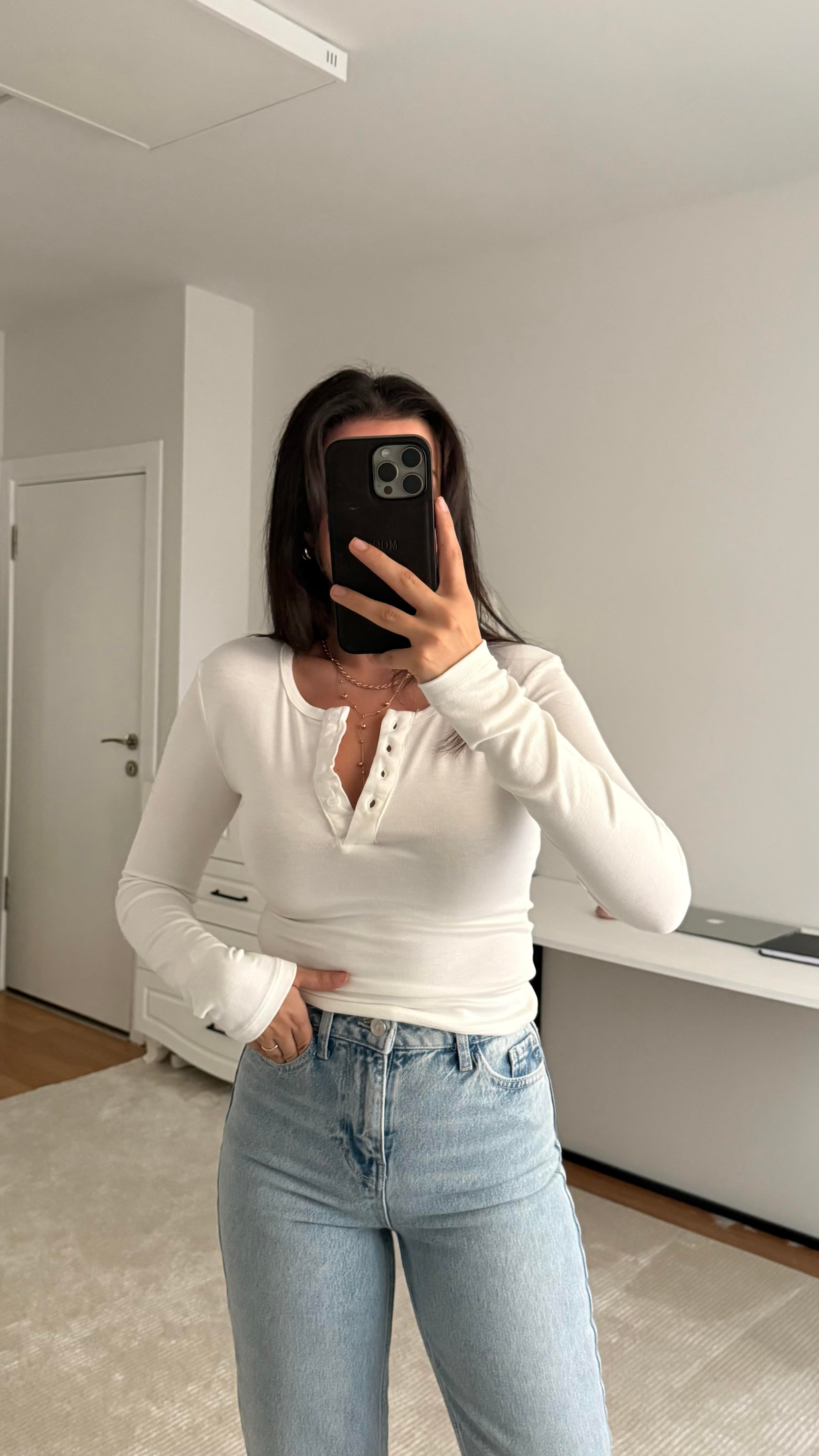 Beyaz Düğmeli Bisiklet Yaka Uzun Kollu Tişört