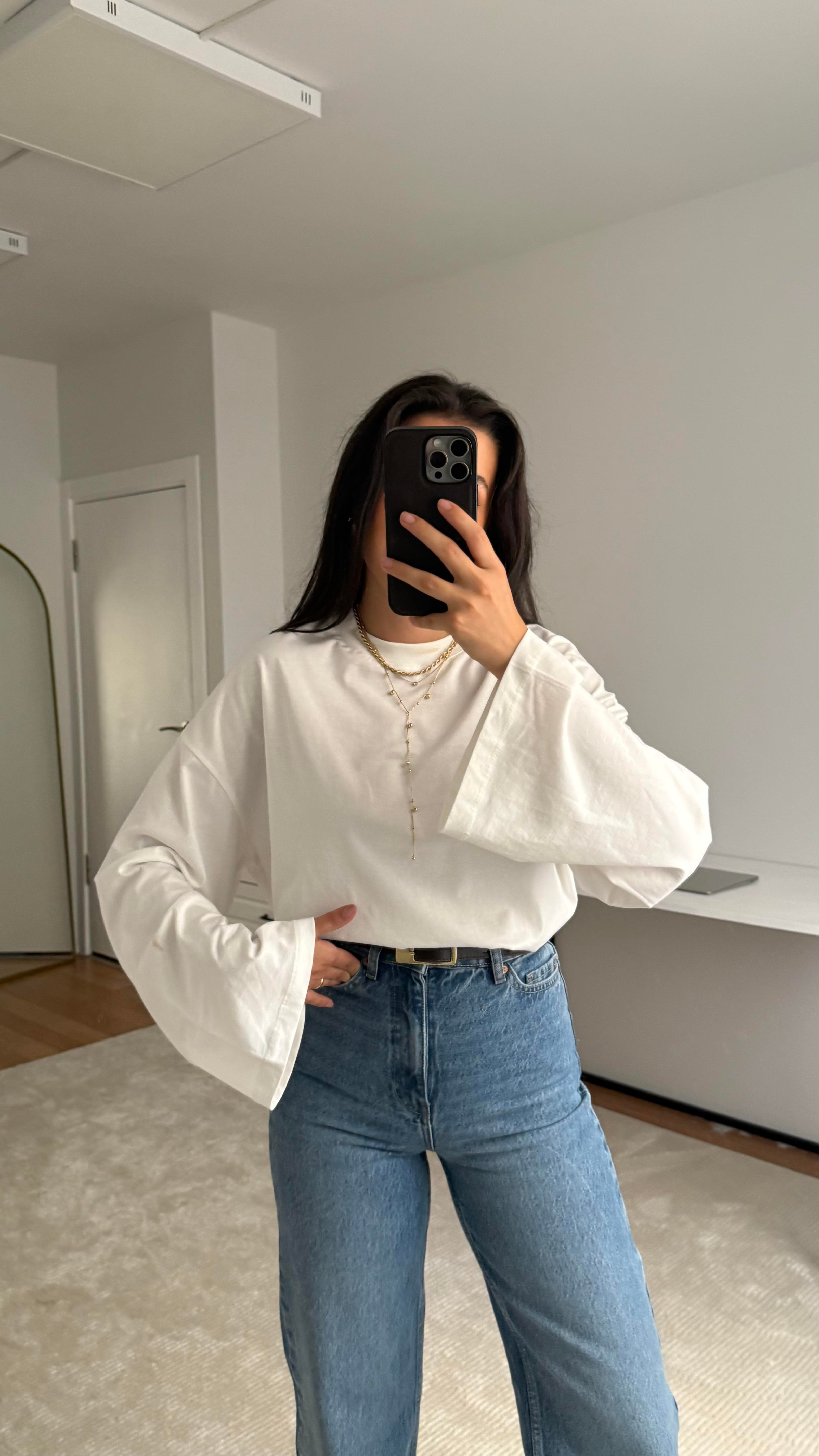 Beyaz İspanyol Kol Bisiklet Yaka Tişört