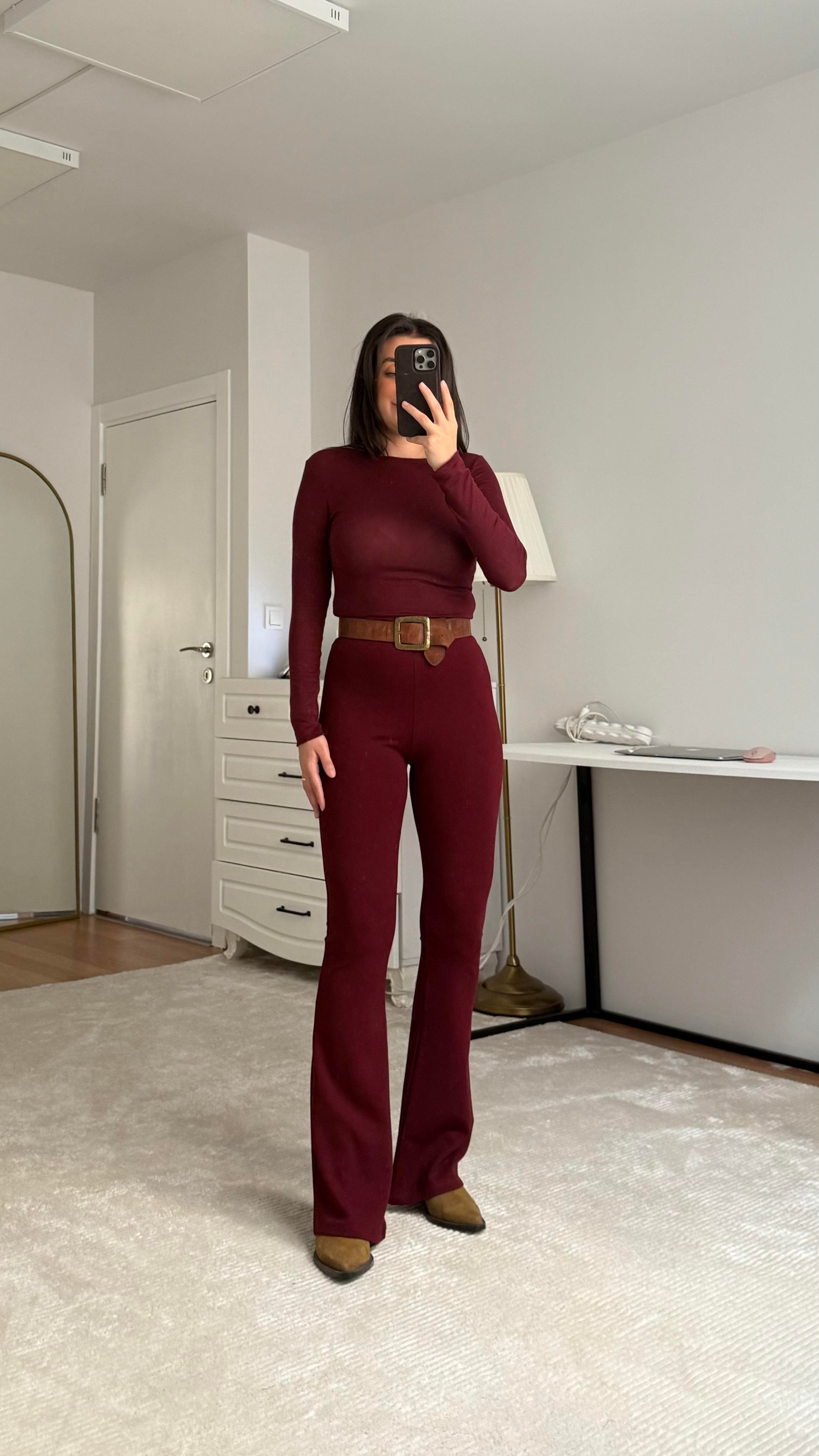 Bordo Yüksek Bel İspanyol Paça Pantolon