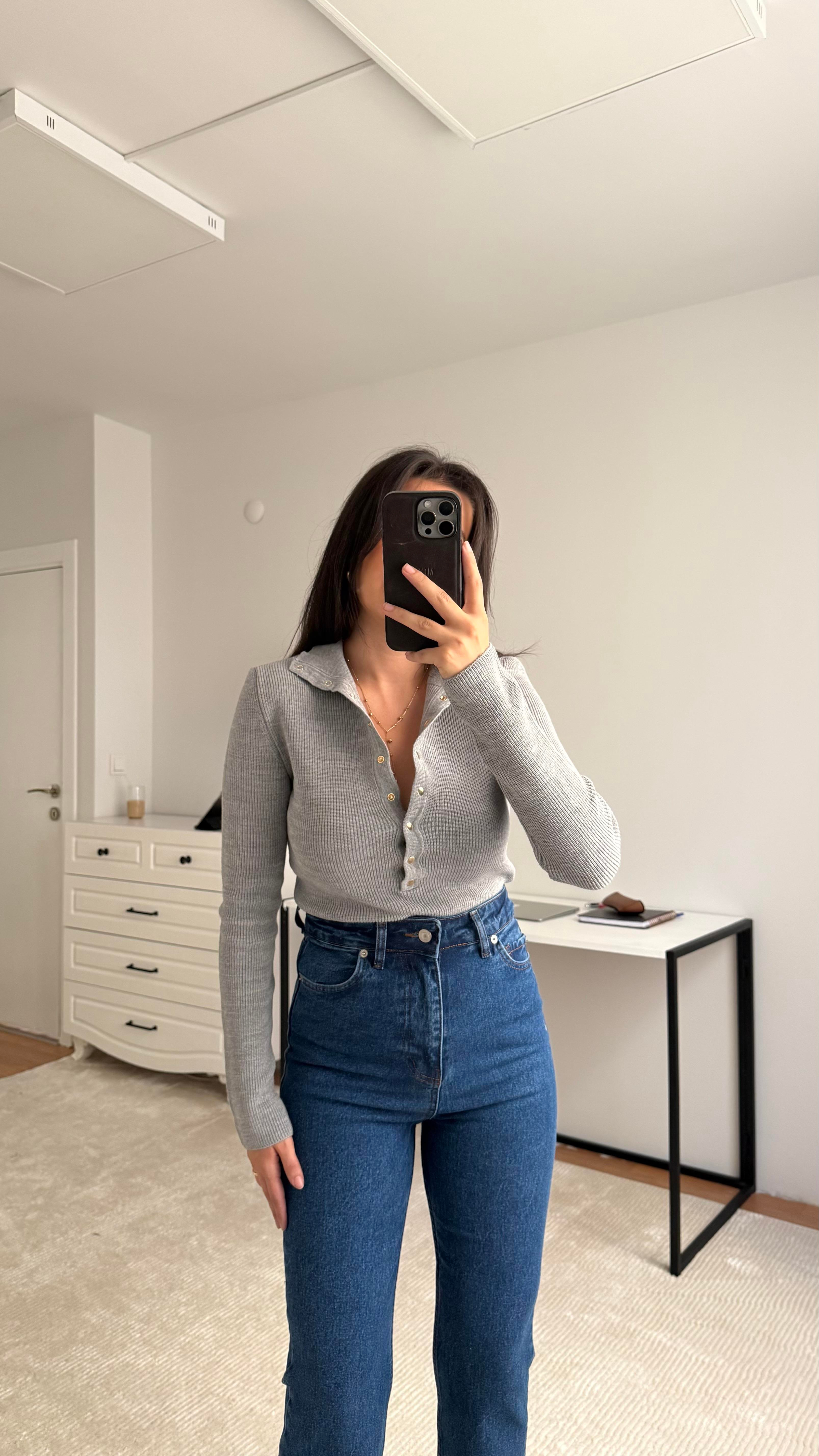 Gri Çıtçıtlı Dik Yaka Uzun Kol Triko Yelek