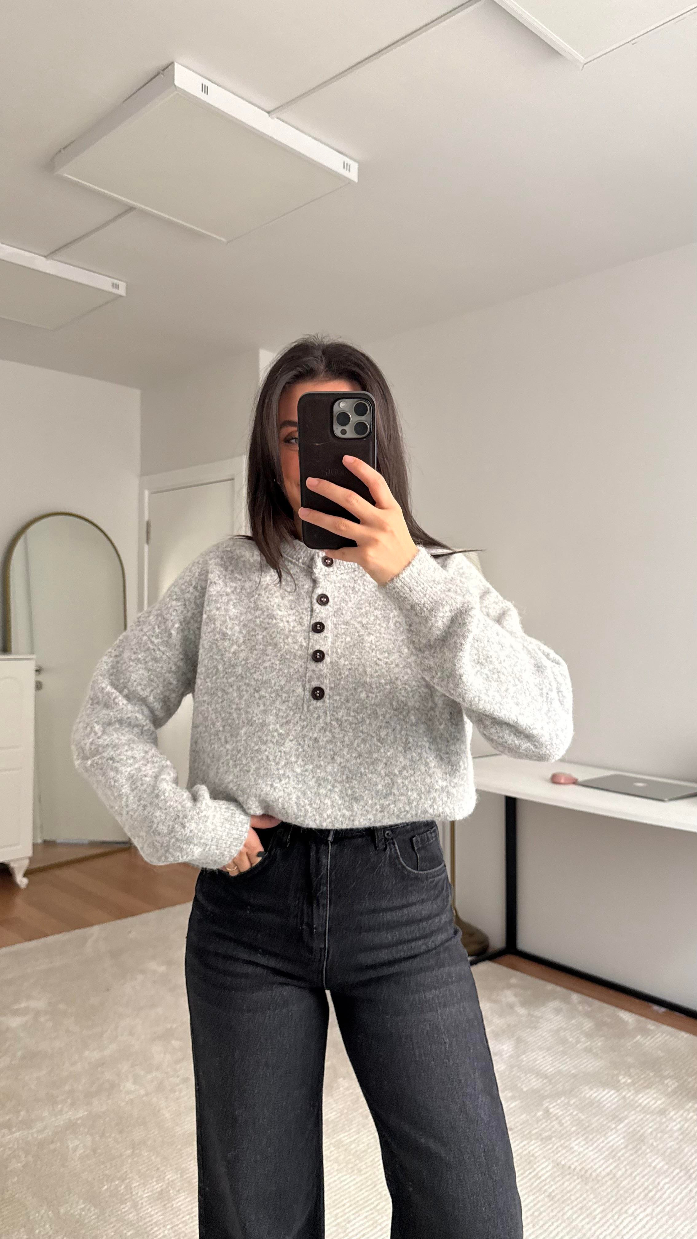 Gri Düğmeli Bisiklet Yaka Triko Kazak