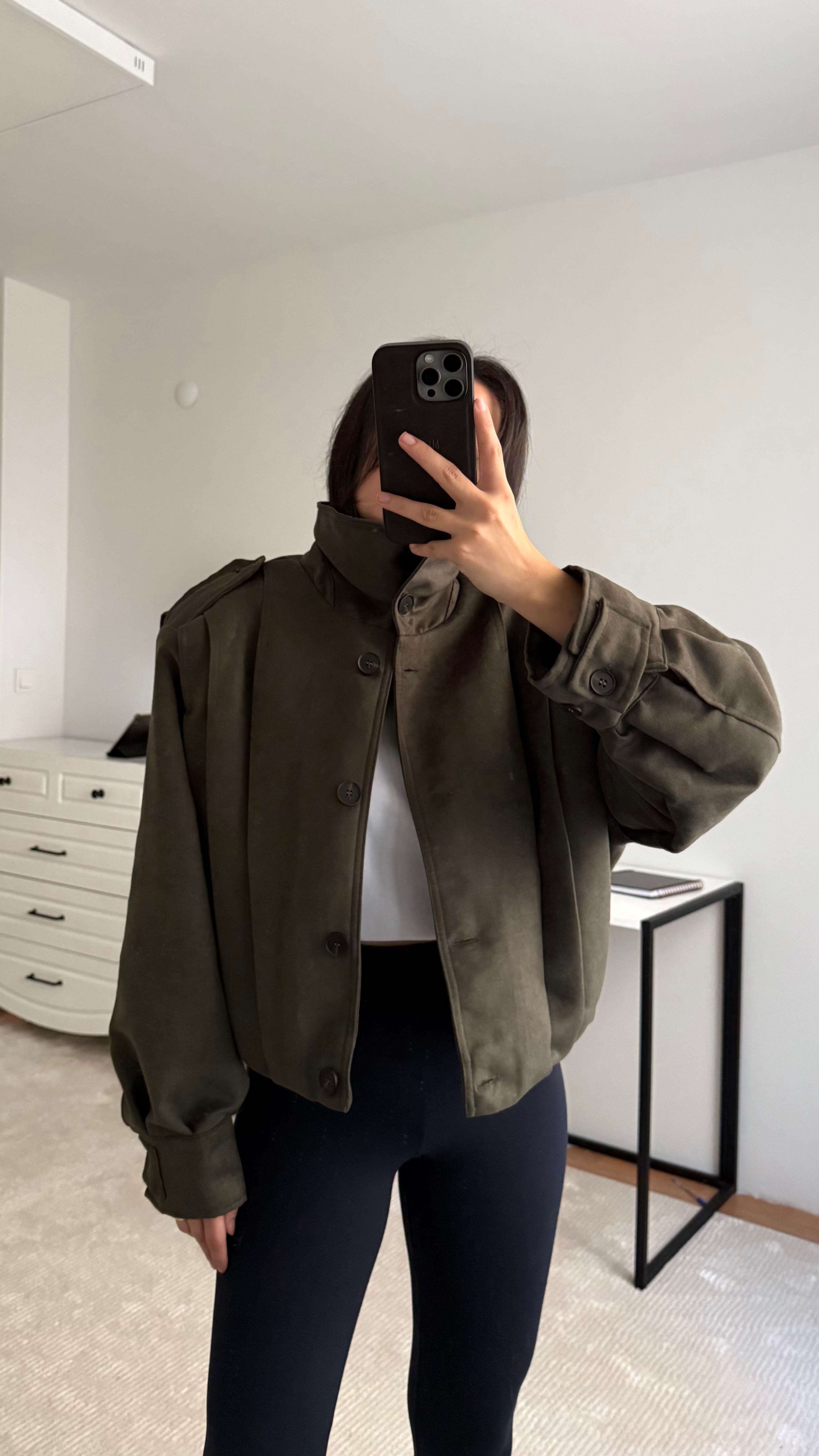 Haki Süet Vatkalı Dik Yaka Bomber Ceket