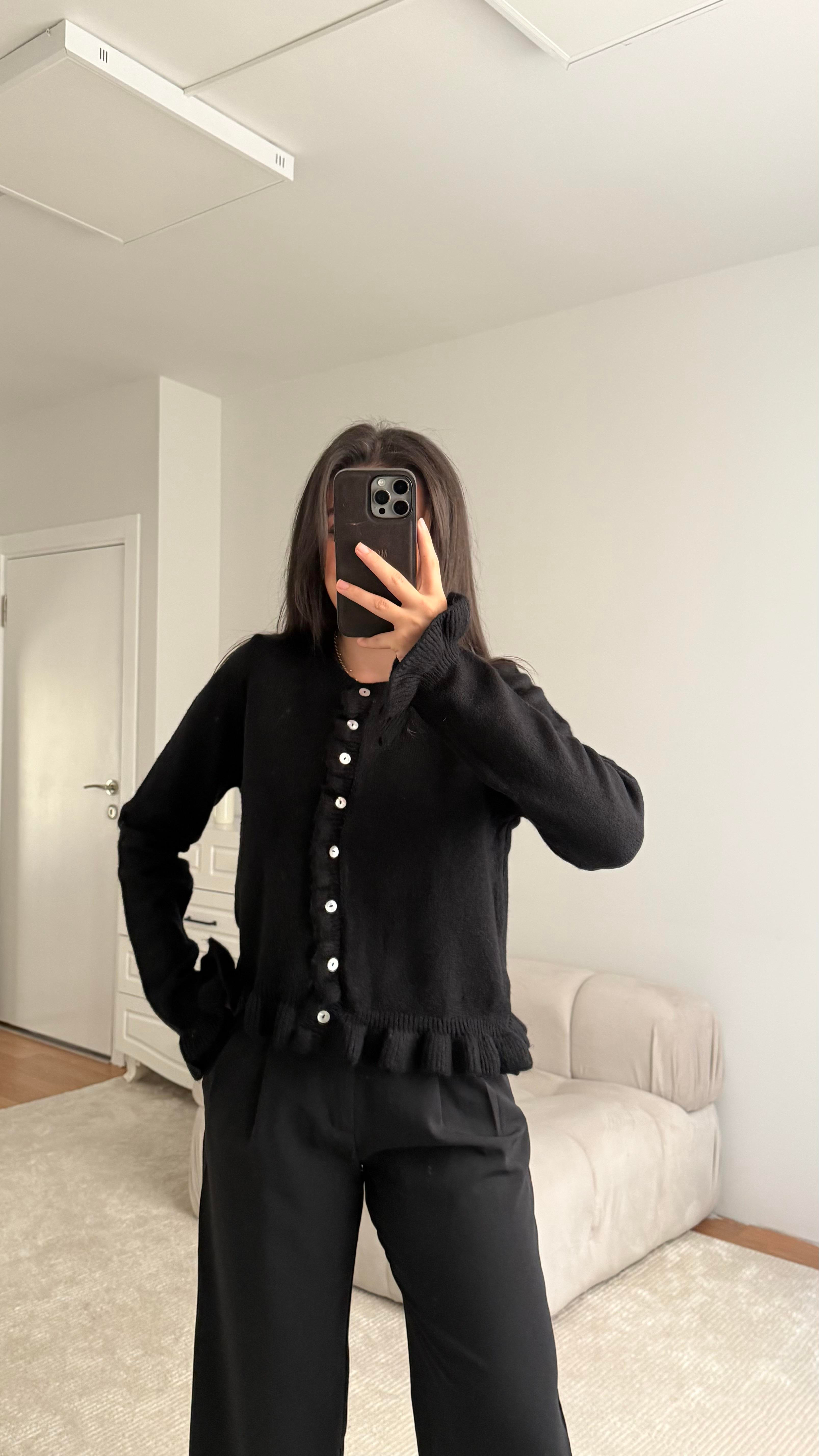 Siyah Bisiklet Yaka Fırfır Detaylı Düğmekli Triko Hırka
