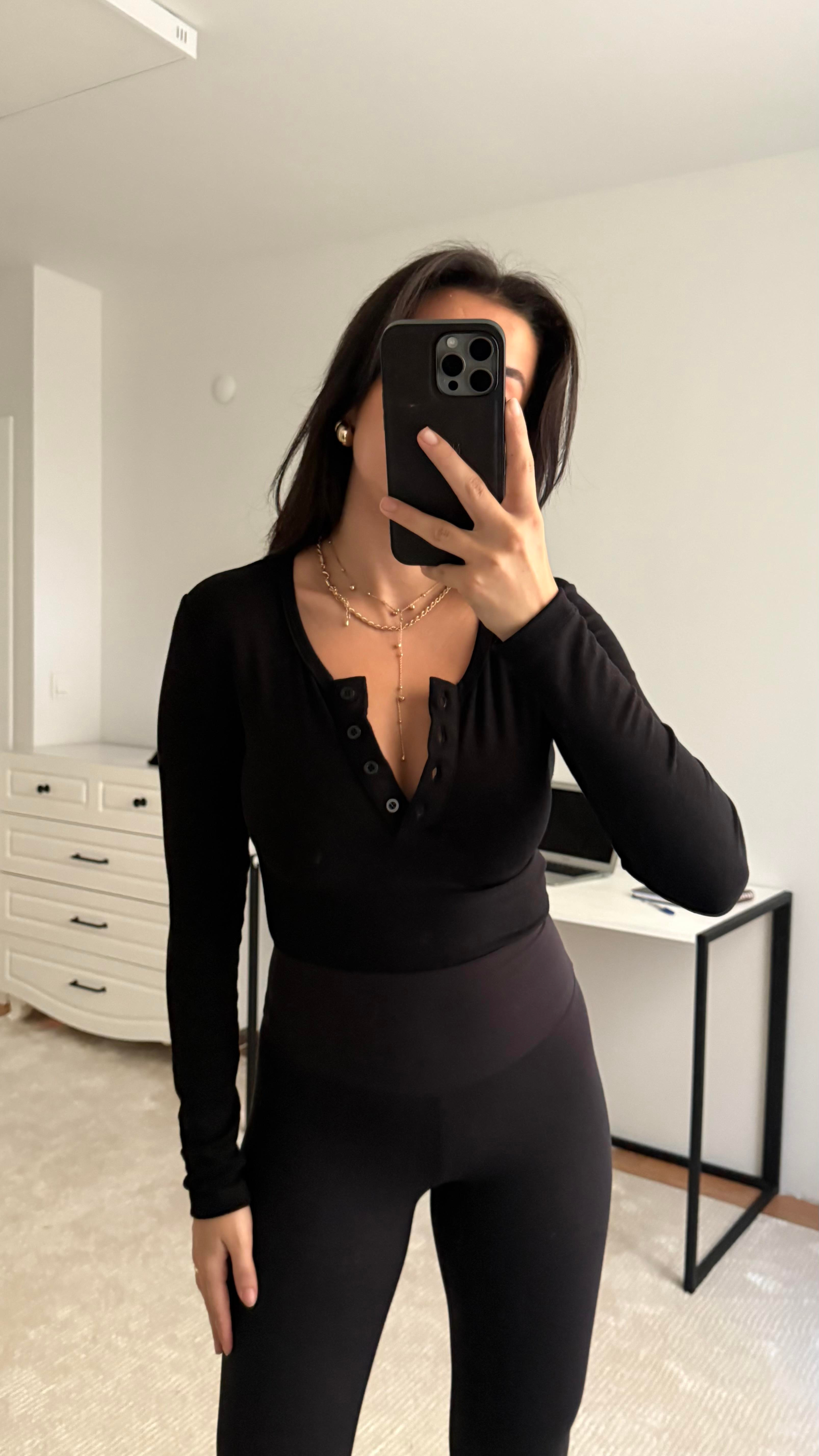 Siyah Düğmeli Bisiklet Yaka Uzun Kollu Tişört